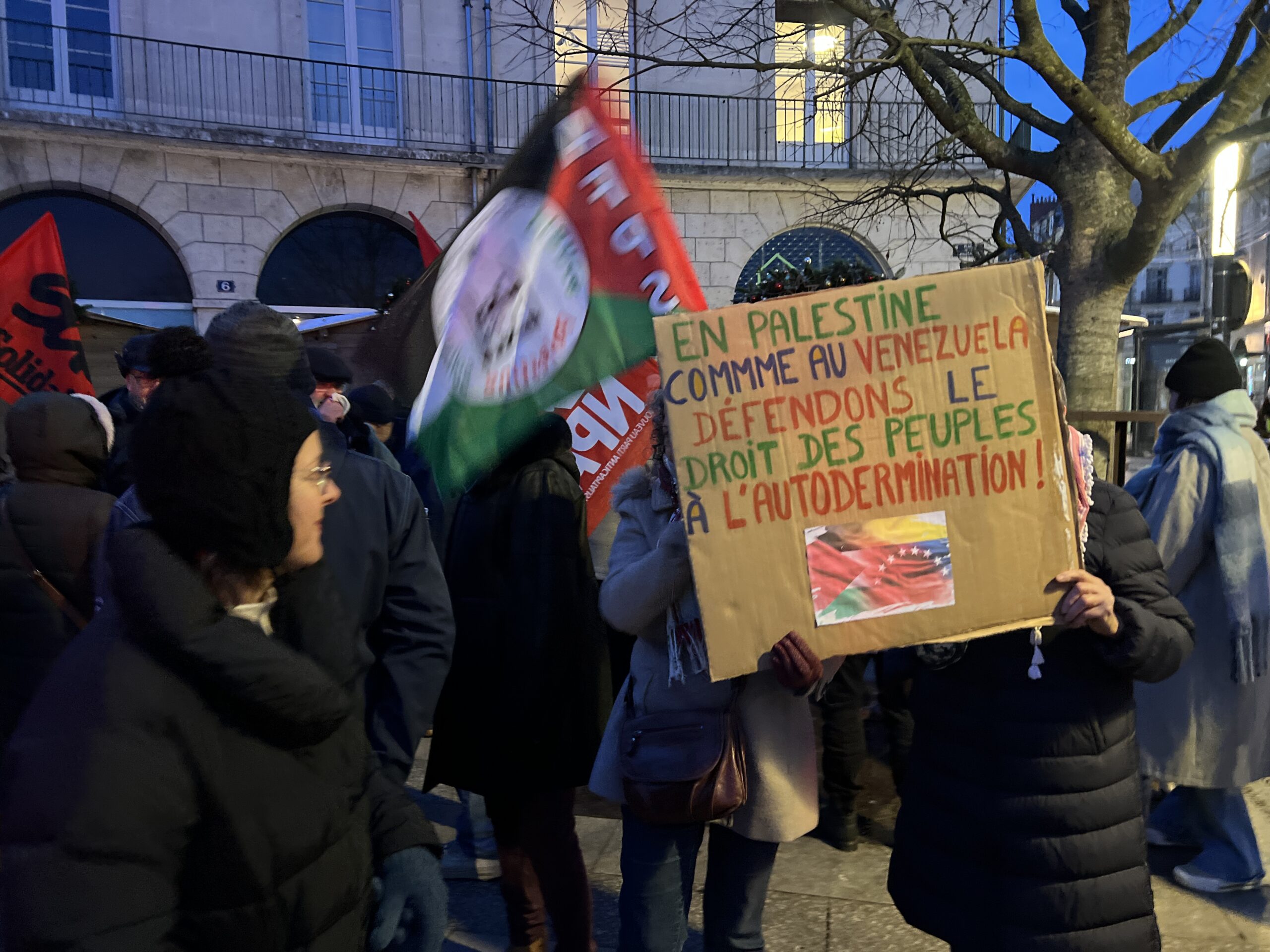 « L’impérialisme, c’est la guerre. En Palestine comme au Venezuela, défendons le droit des peuples à l’autodétermination », peut-on lire sur les pancartes brandies par les manifestants. Dans le froid de ce lundi 5 janvier, les slogans résonnent place de la Résistance, à Blois.